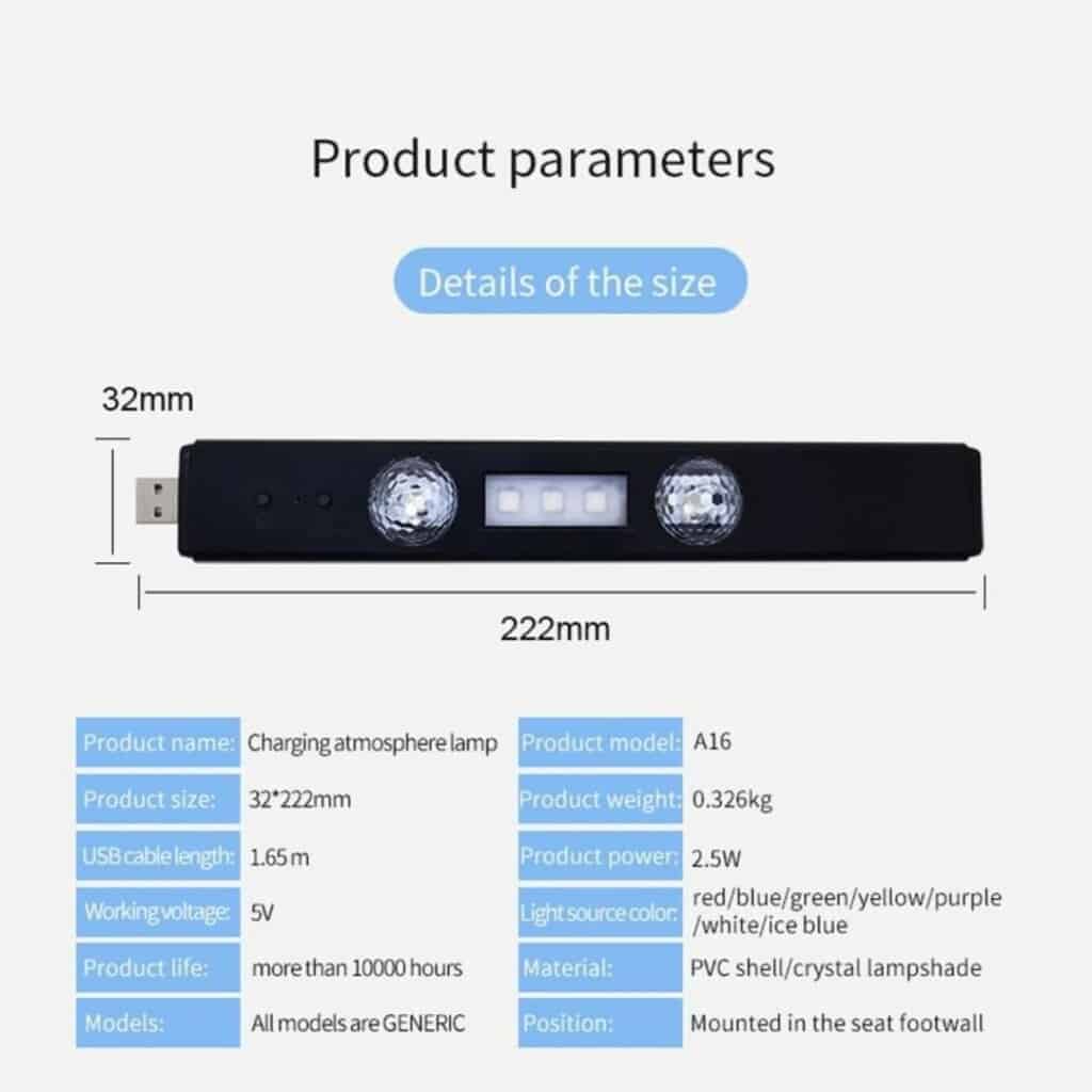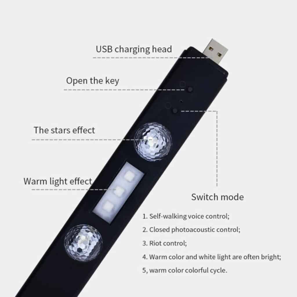 • ¡Las barras de luz se cargan a través del cable USB y no requieren cables para configurarlas! Debido a las cintas magnéticas puedes colocarlas en cualquier lugar en tu coche.
