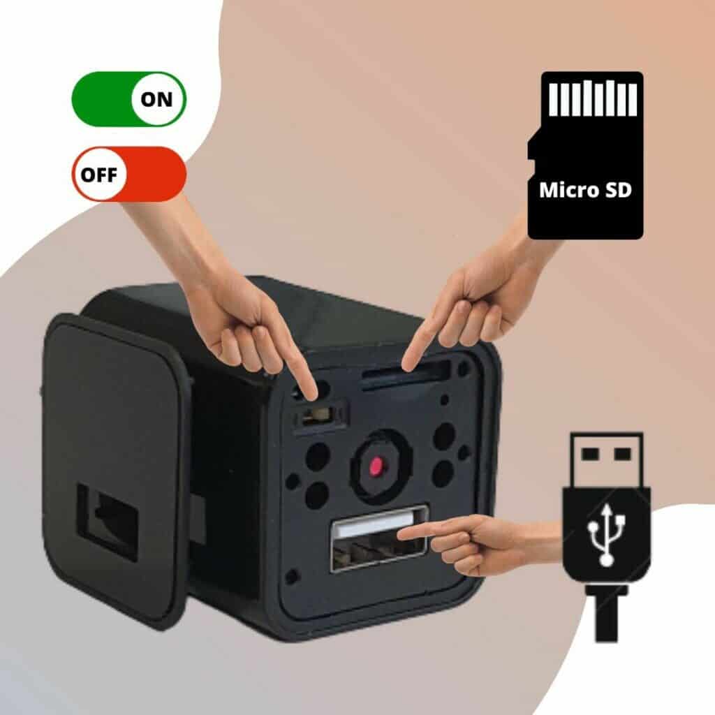 • Este cargador USB cuenta con un micrófono incorporado y una cámara de 1080p con un sensor de movimiento que se activa cada vez que detecta movimiento.