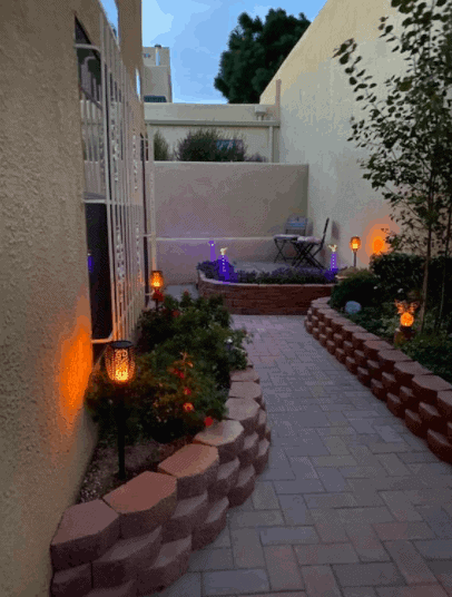 ¡Hombre, mi jardín se ve completamente diferente por la noche! Usé las luces para iluminar el camino hacia el patio y ¡parece un cuento de hadas!