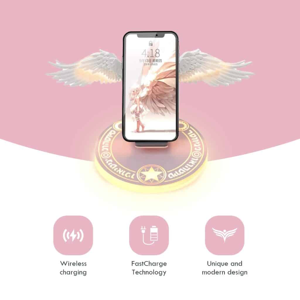 • La base de carga inalámbrica lleva la tarea cotidiana de cargar el teléfono a un nivel emocionante con un práctico soporte de carga rápida y un increíble efecto de alas de ángel.