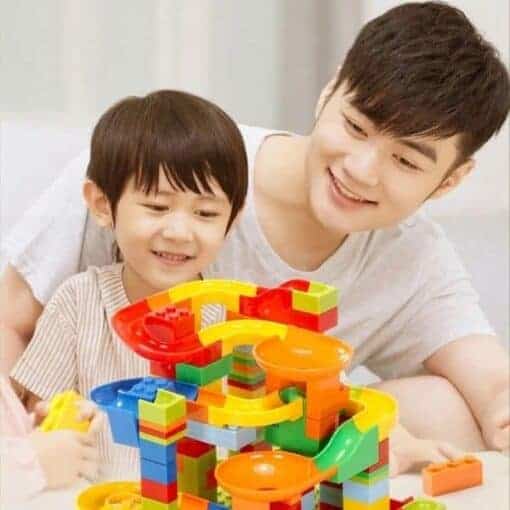 A mi hijo le gusta cuando juego con él en sus circuitos. ¡Contamos el tiempo para ver quién bajará su bola más rápido! ¡Este juego realmente lo hace feliz!